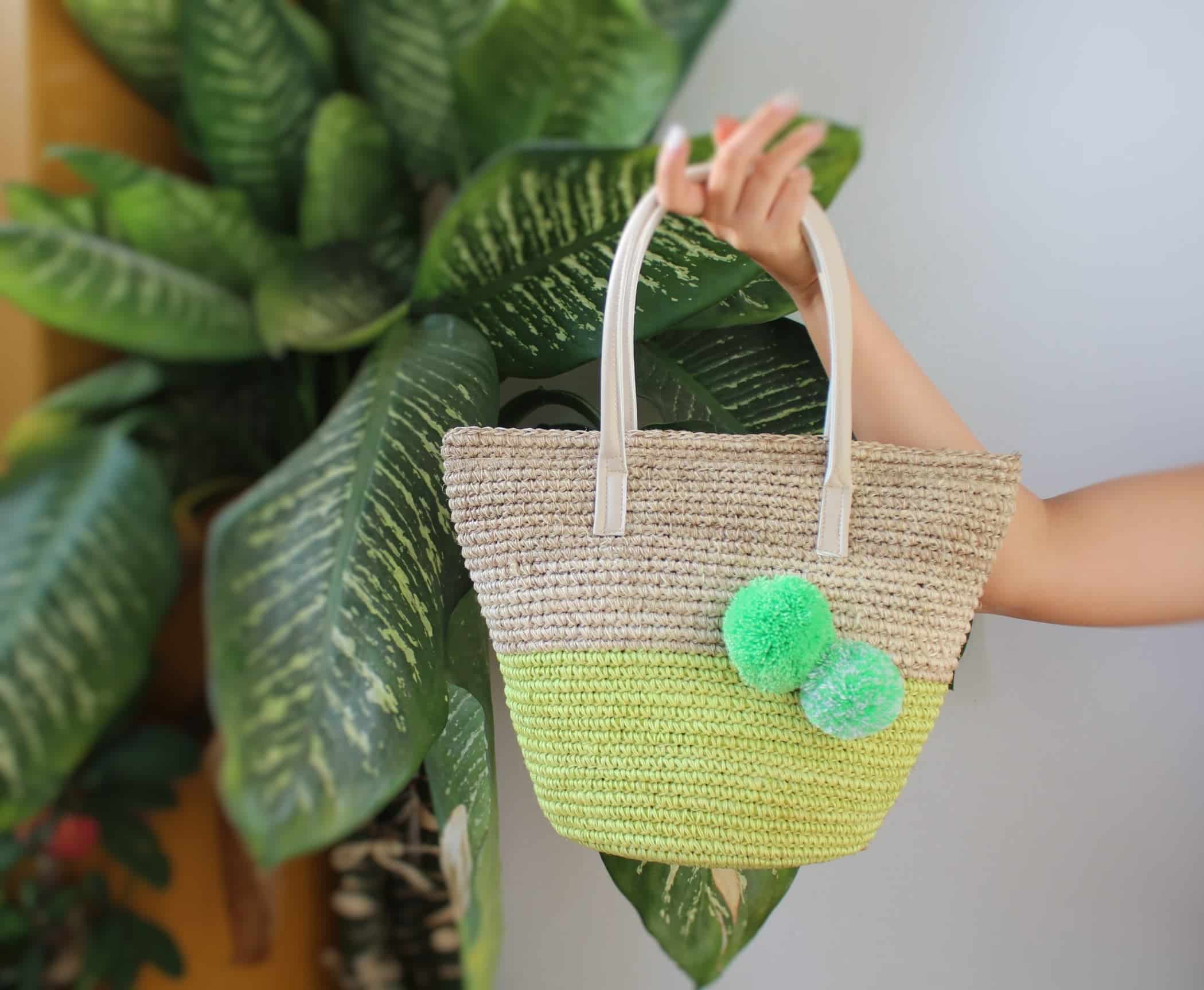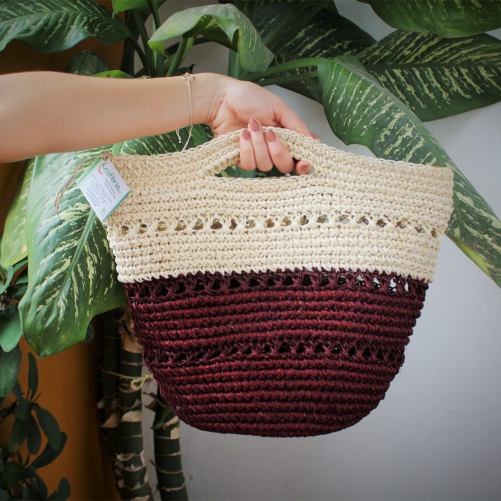 Basic two-tone basket in fique with Colombian leather handles, with internal lining, closure and handmade thread pompoms. Ideal for a casual day or a day at the beach. Made Curití Santander.