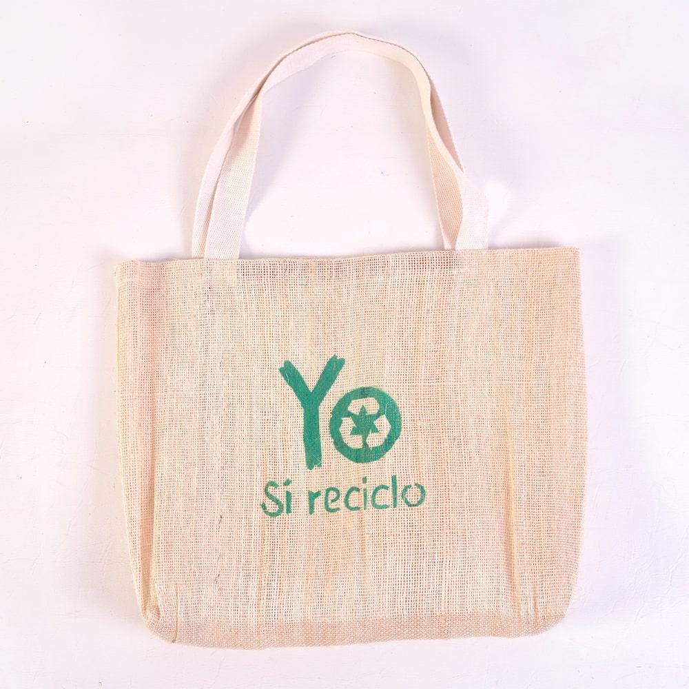 Ecological market bag, sparse fabric with vegetable ink print, made of 90% fique 10% cotton, friendly to the environment. With resistance test to support up to 15 kilos of weight.